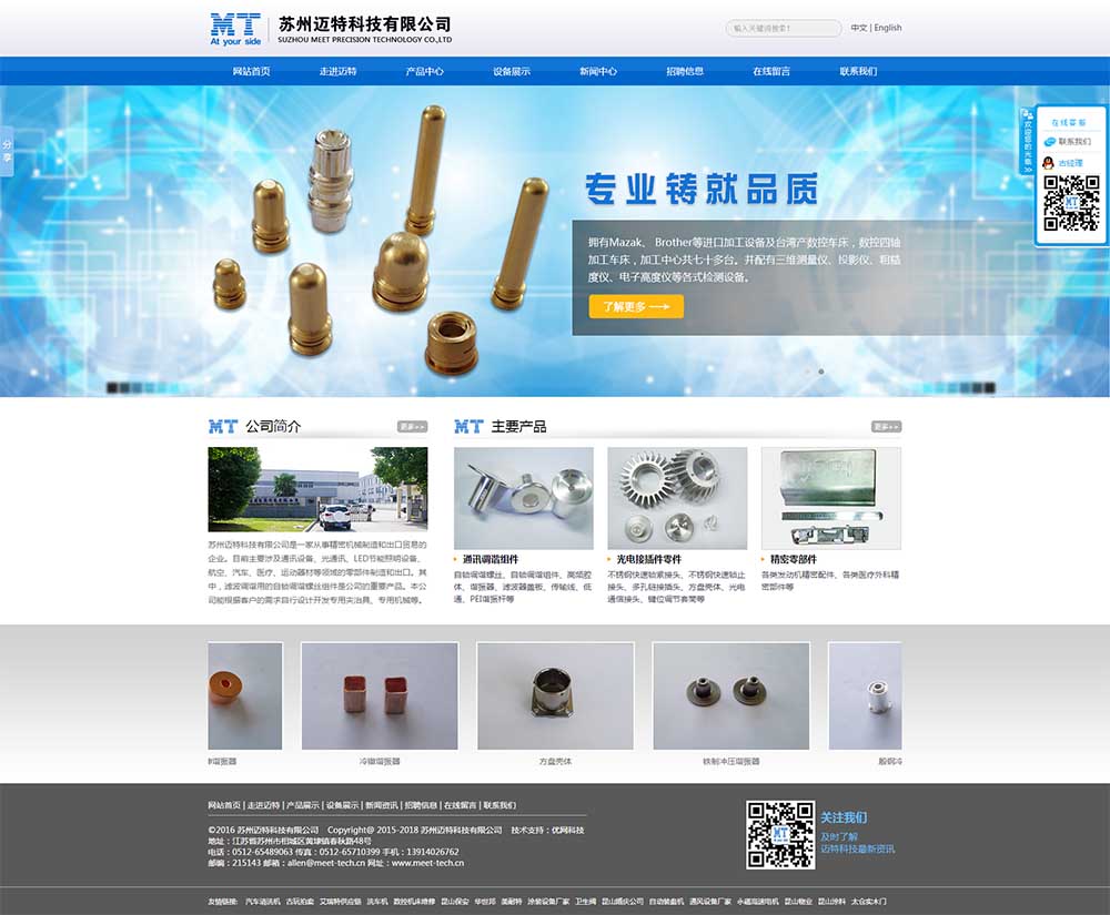 苏州迈特科技有限公司是一家从事精密机械制造和出口贸易的企业。目前主要涉及通讯设备、光通讯、LED节能照明设备、航空、汽车、医疗、运动器材等领域的零部件制造和出口。其中,滤波调谐用的自锁调谐螺丝组件是公司的重要产品。本公司能根据客户的需求自行设计开发专用夹治具、专用机械等。